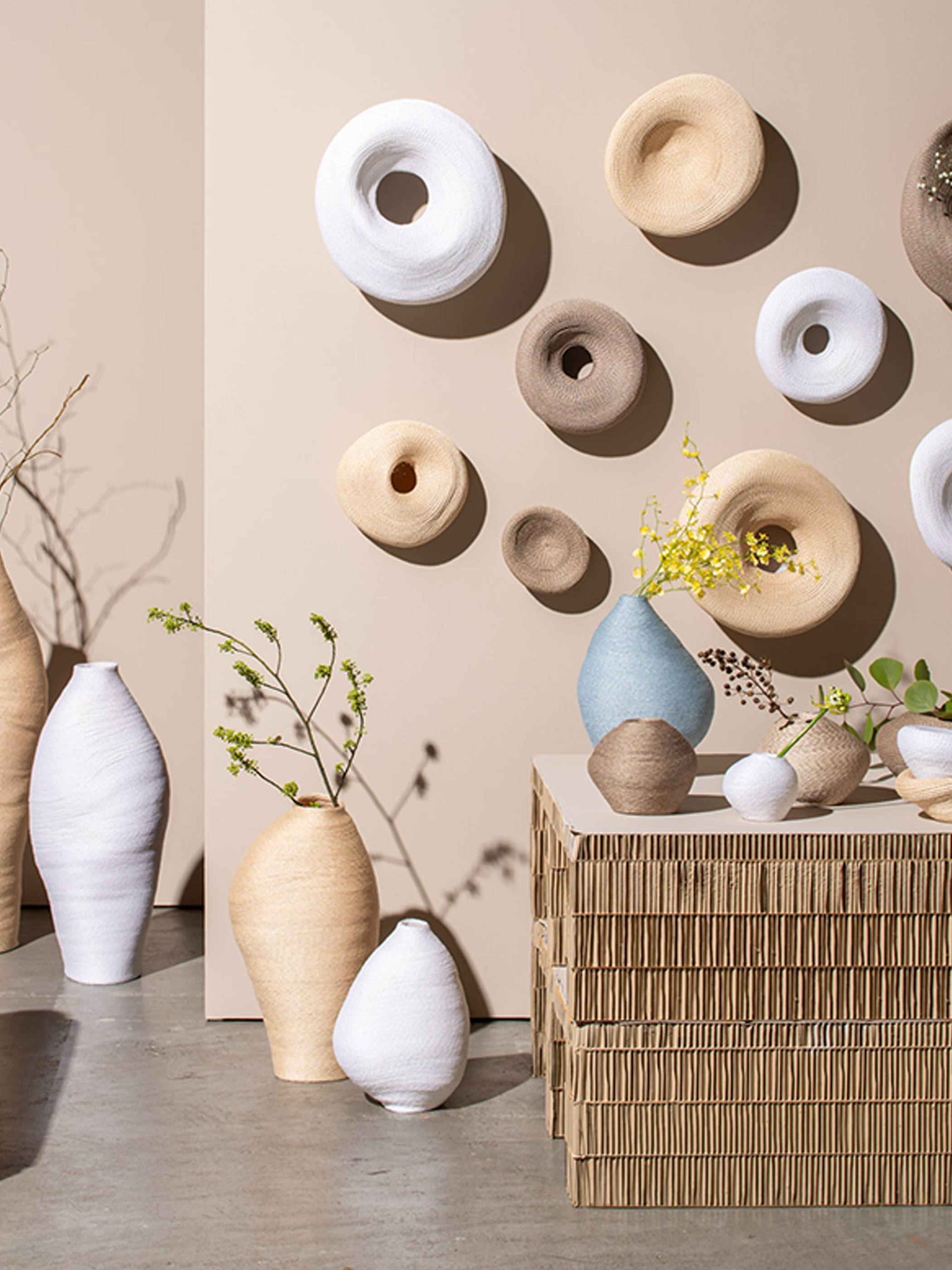 紙糸に2色の綿糸を絡ませて組み上げたブレードから生まれた一輪挿しです。45度に傾いたジオメトリックなフォルムが動きを感じさせながら、花や葉の有機的なラインを引き立て、複数並べると心地よいリズムを生み出します。